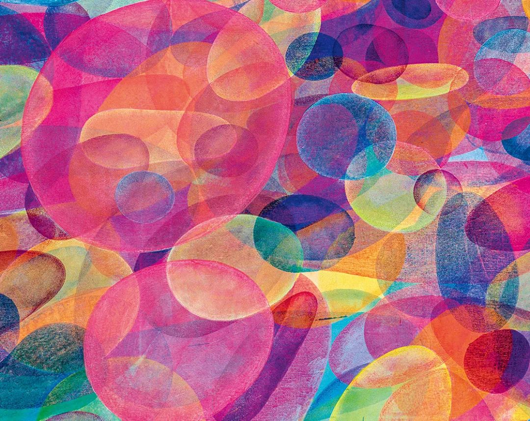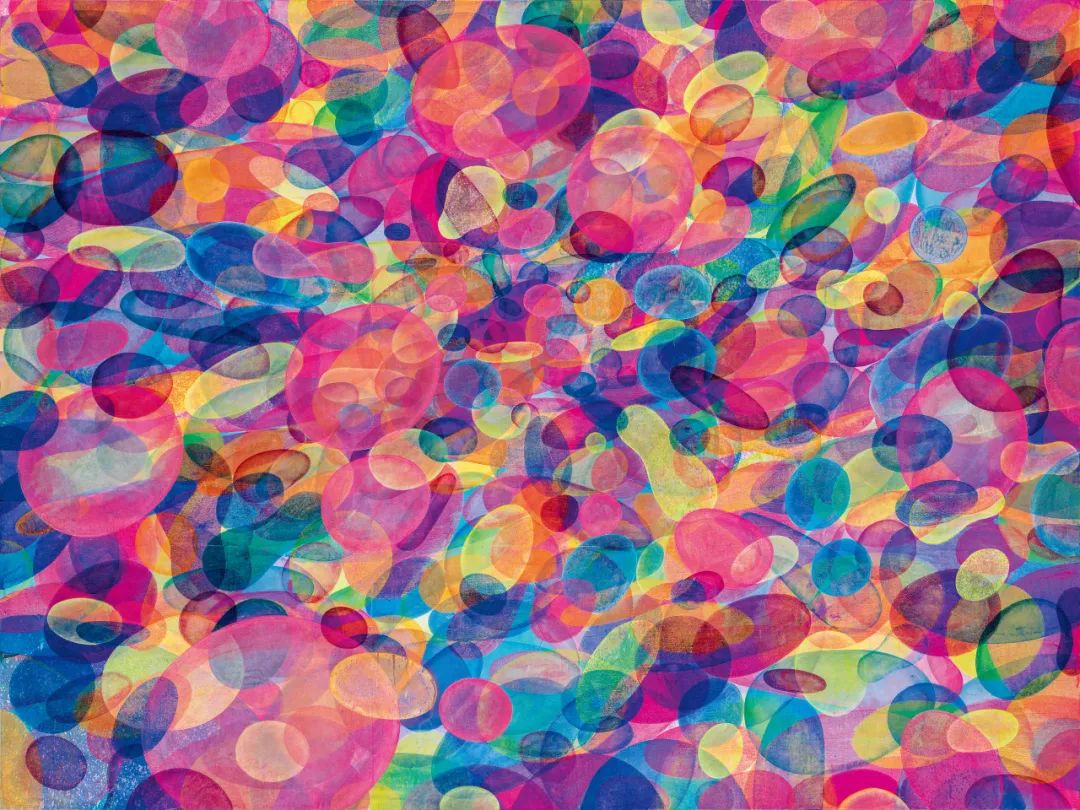 在2021-2022年创作的《气泡》一作中,无数个气泡在明灭不定的光线中若隐若现,荧光黄、桃粉、钴蓝、翠绿、暗红等纯度极高的饱和色彩相互碰撞激荡永不停歇,涌动着强烈的画面动感与视觉张力。在他的笔下,明灭不定的“气泡”如同世间芸芸众生,于时间的洪流中短暂遗留、稍纵即逝。而作为一种隐喻,气泡既似某种时间洪流中的微弱遗存,犹如盛景狂欢之后的虚空,颇有浮生若梦的悲剧色彩。