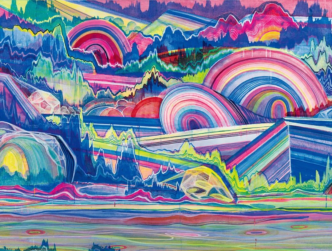 “其实荧光色从很早的时候就开始了。从最开始的时候不是这么多,到后来越来越多,其实我就是想用一种属于我们这个时代的、有这个时代的特色的颜料夹杂在里面。就跟古人用矿物质颜色,是因为这些颜色本身就赋予了他们时代的特征,我觉得我们的时代,用一些亮色和荧光色,还有化学颜色,可以让颜料以我们这个时代的特征保留在画面里。”