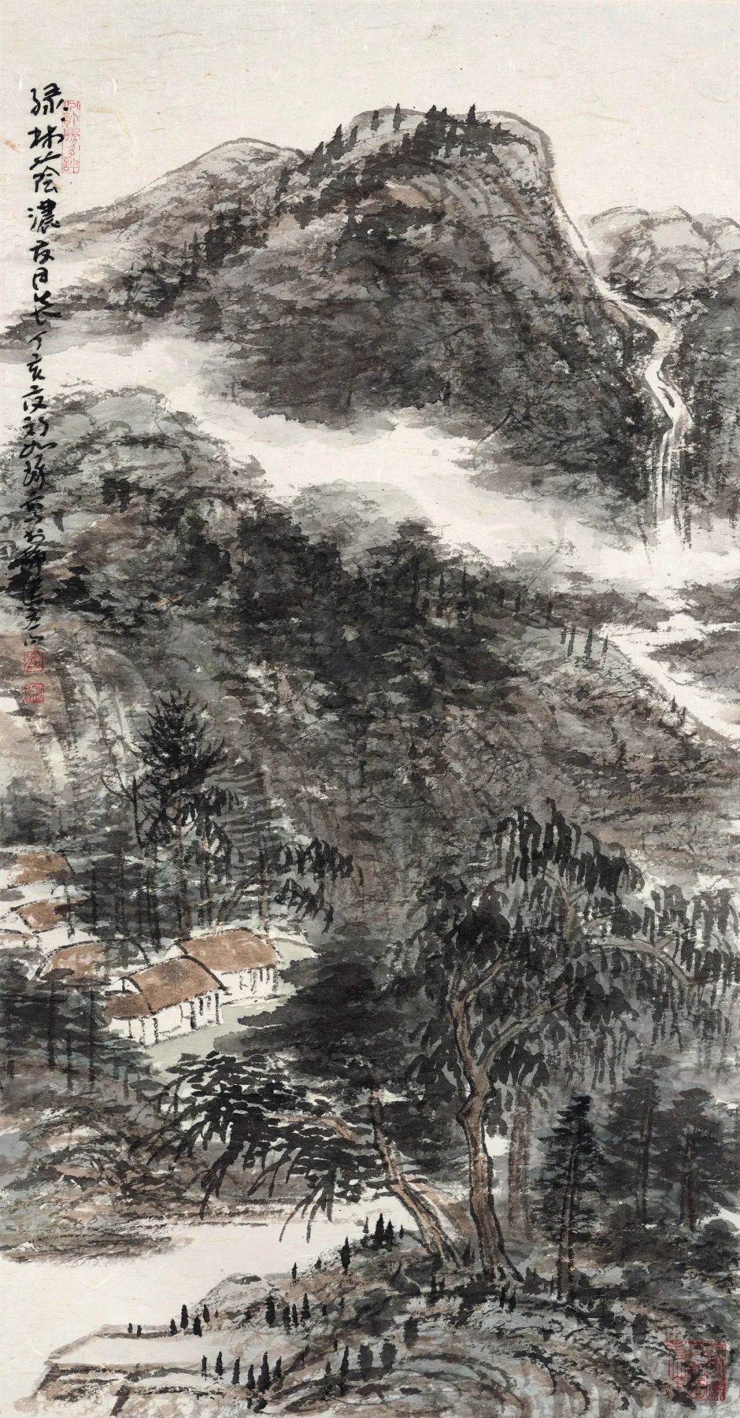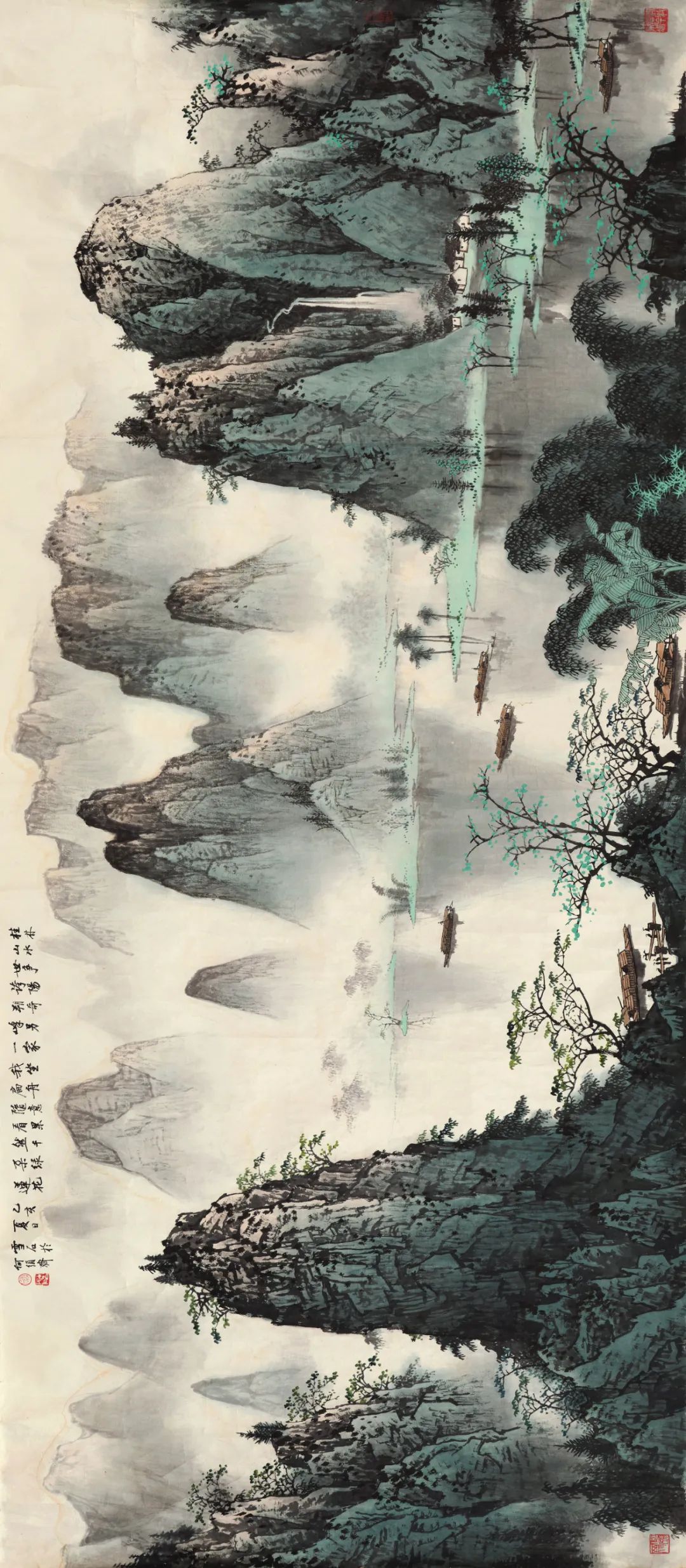 白雪石山水中的漓江系列山水,最能集中代表画家在传统山水画革新方面突出的艺术成就。其漓江山水,无论是雄浑浓重,秀润空灵,还是疏淡迷蒙,无论是绝句式抒情小景,还是长卷巨制,画家皆能以其娴熟老辣的笔墨功夫,运用浓、淡、干、湿、泼、破等不同墨趣,勾、皴、点、染的不同笔情,恰到好处的挥写漓江晴、云、雨、雾中山光水景迷离的微妙变化。