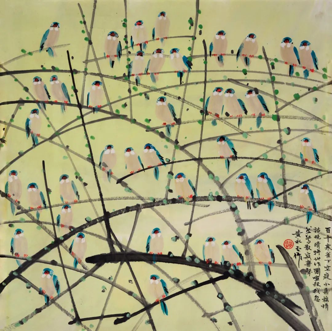 【题识】百千寒雀下空庭,小集梅梢话晚晴。特地作团喧杀我,忽然惊散寂无声。黄永玉作。