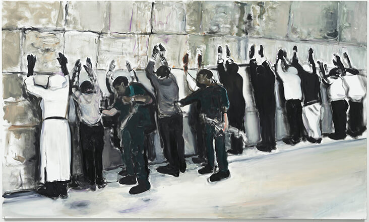 正因如此,在杜玛斯的艺术创作中,从不避讳政治与冲突的议题,尤其是对以色列与巴勒斯坦长期冲突的直接描绘,她多件作品都直面这一持续数十年的冲突。尤其在 2009 年的画作〈围墙〉(The Wall)中,她以报纸剪报为素材,描绘一群正统派犹太人穿越耶路撒冷的西墙,前往伯利恒的拉结的坟墓(Rachel's Tomb)进行祈祷。同年创作的〈墙之哀〉(Wall Weeping)则取材自一张照片,画面中以色列国防军正在搜查一群巴勒斯坦男子。这些男子面向墙壁、举起双手的姿态,在杜玛斯的画中被重新诠释,不仅呈现为屈服或被压迫的象征,也可能是祈祷、寻求庇护或沉思的动作,开放观者多重解读。