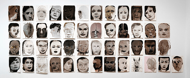 杜玛斯许多作品看起来像是在描绘肖像,但更准确的说,是艺术家试图表现出各种人类的状态。她笔下的人物,可能是朋友、陌生人、公众人物,甚至是她自己的孩子,但这些脸孔与裸体从不只是单纯的再现,而是运用松散、流动且富有表现力的笔触,让颜料在画布与纸张上自由蔓延,强调人物的脆弱、感性与内在情感。尤其是杜玛斯 1994 年发展的《模特》(Models)系列,便是以黑白肖像描绘不同女性,而这些对象包括精神病患、模特儿、女演员与艺术家等,展示出女性身份的多重性。