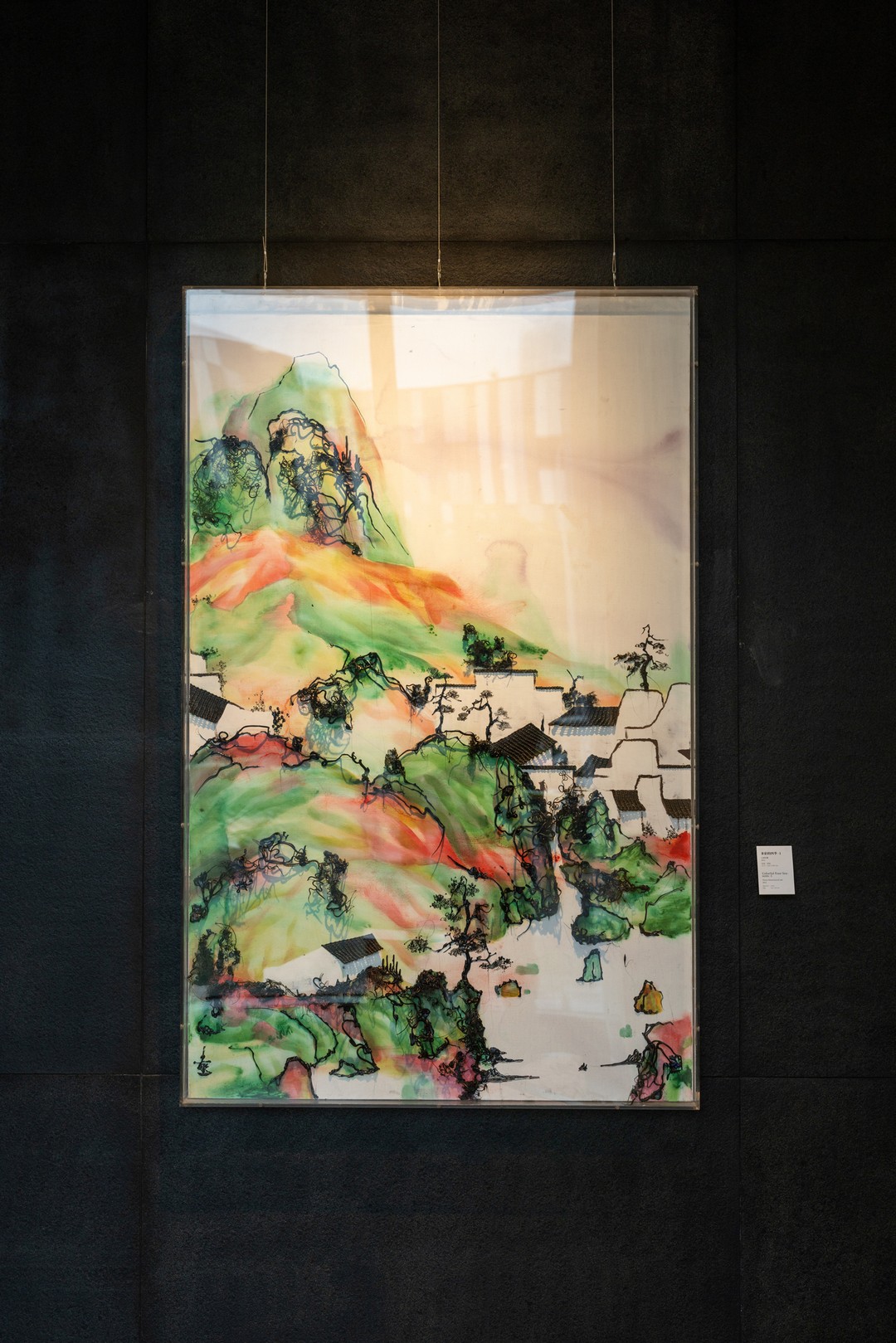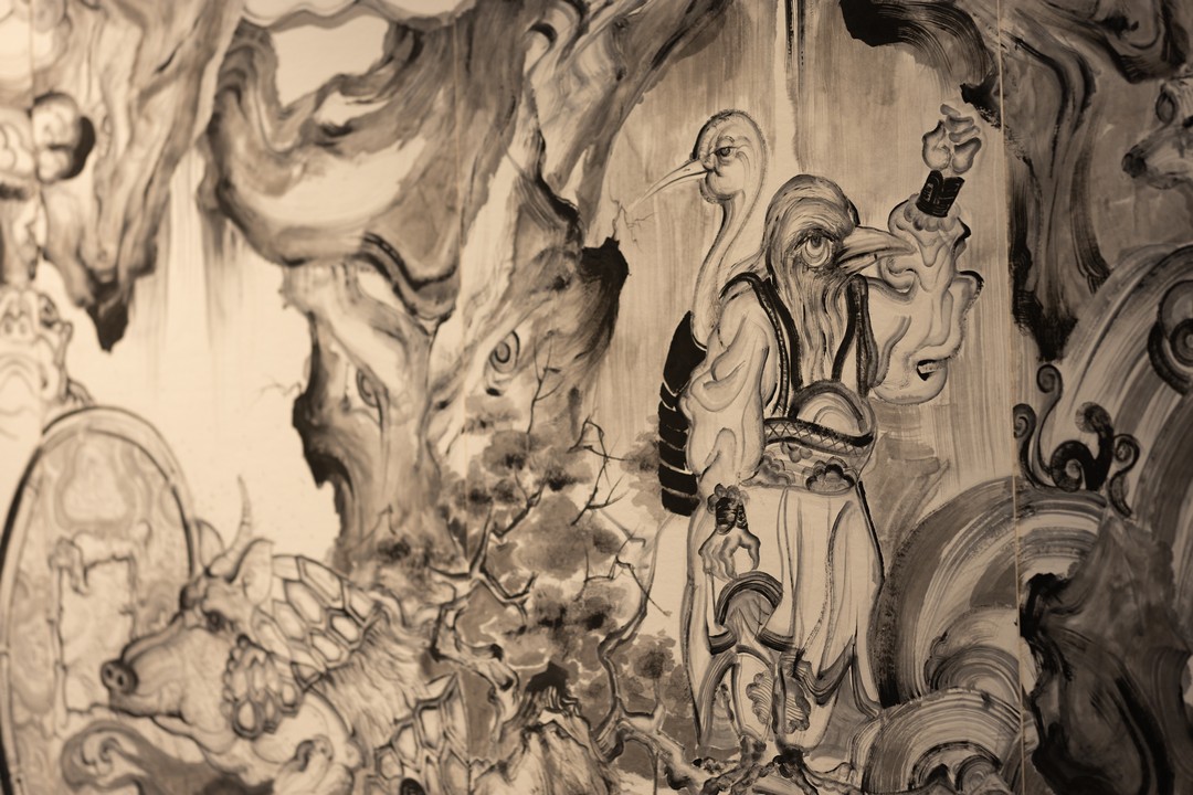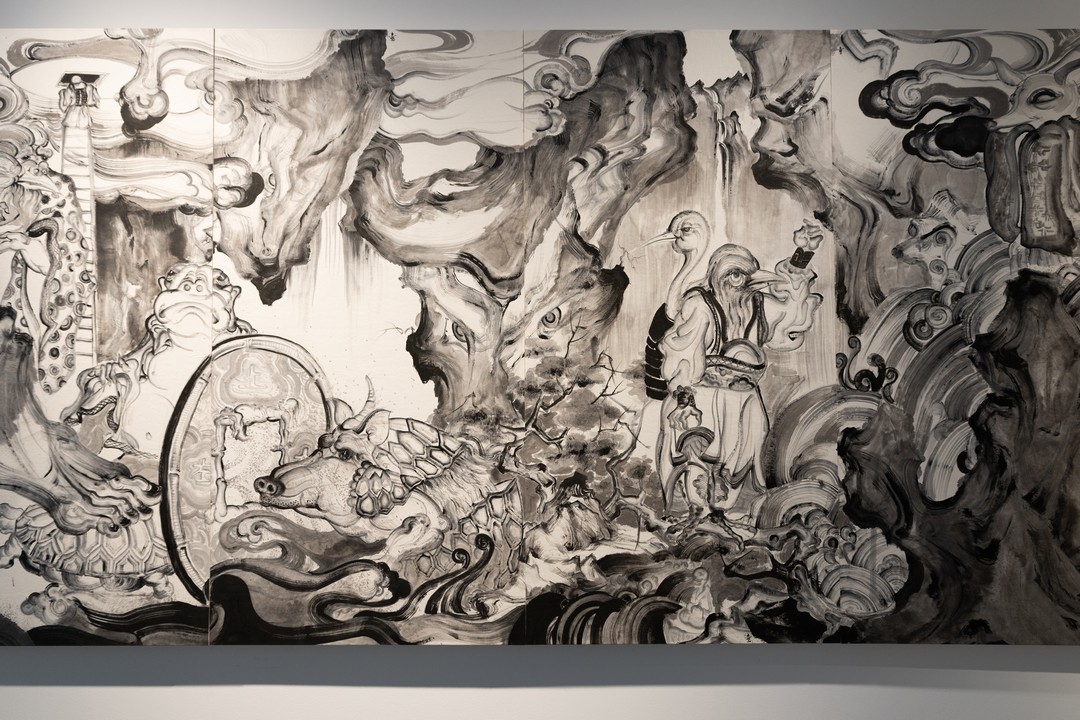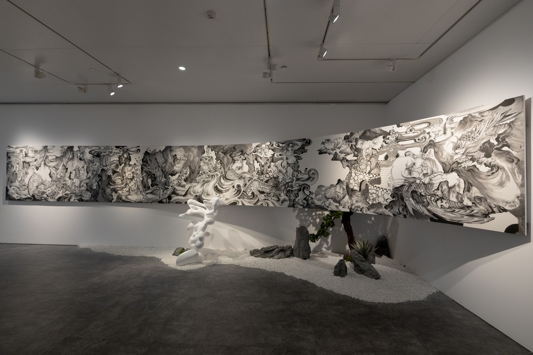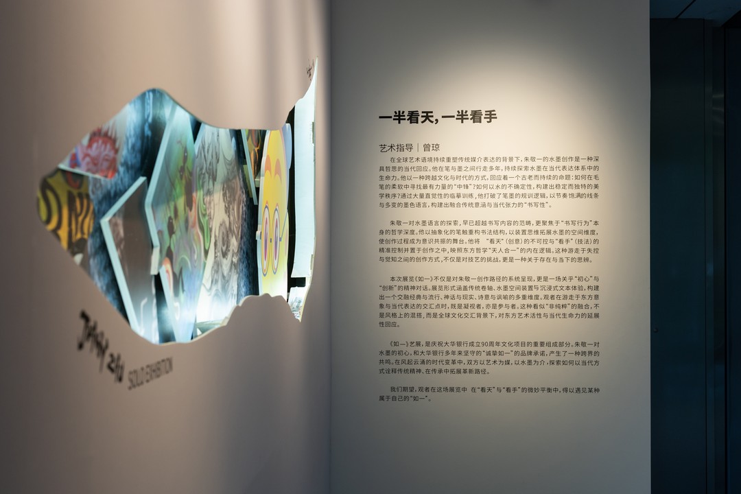 本次展览“如一”不仅是艺术家个人精神的凝练,更是其对艺术创作中“初心”与“创新”的回应。“如一”汇集艺术家多件独具个人风格的代表作,在视觉与精神双重维度上打造出一个融合传统意涵与当代表达的复合性现场。现场展出作品包括定制主题装置《如一》、园林构造与水墨意象交织的《游园敬梦》、打破平面限制的系列作品《立体的墨》,以及代表性书法与绘画作品《南门书法》《水墨万物》《妖野荒踪》等,构成一个可视、可游、可思的多维度空间,全面勾勒出朱敬一近年来在材料、技法与观念上的拓展轨迹。