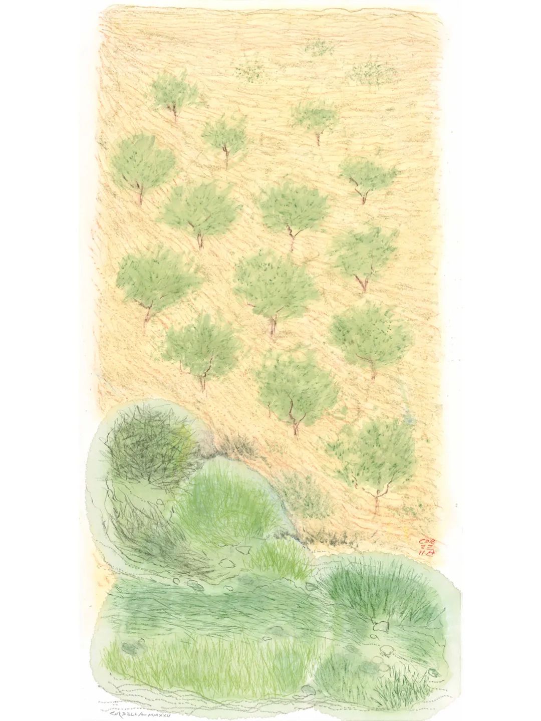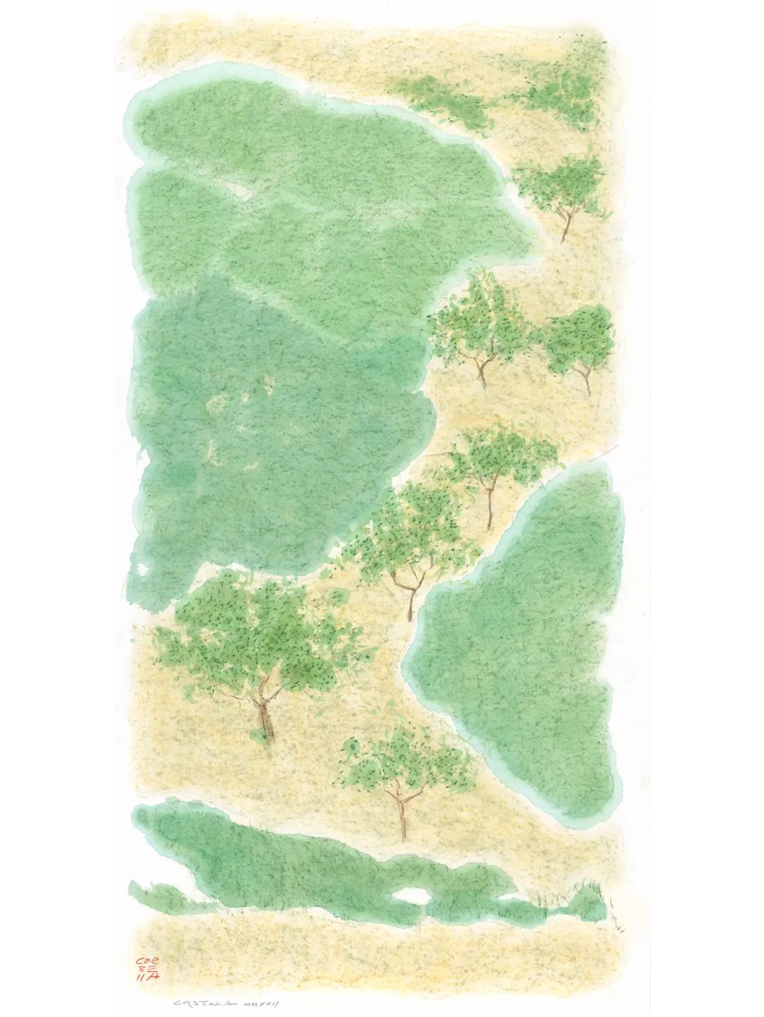 展览以"不可见的风景"为主题,诠释了艺术家对平凡景观的独特认知。葛伯牙认为:“风景与人有相通之处——有些更受欢迎、引人注目,它们的存在仿佛就是为了脱颖而出;而另一些则更加朴素、简单,或许更深刻,无论如何,它们最终是更低调、无名的。”本次展出的科尔布山谷(Vall del Corb)系列,正是对"平凡之美"的展现。艺术家融合东方"雅"的美学理念,通过流动笔触与克制用色,捕捉加泰罗尼亚自然景观在不同季节中的本质特征。
