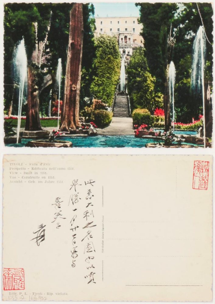 说明:上款为张大千之日本红颜知己山田喜美子。此为张大千游览意大利时明信片,意在将此风景与情人一并赏析,直可视为情书。明信片中风景为罗马周边小镇帝沃利(Tivoli),如大千所说,“以喷泉胜”。张大千与山田喜美子结识于日本,时在解放后,经日本裱画店黄鹤堂主人介绍。张氏曾赠予山田多幅画作,并以其为对象作诗、作画。二人之交往曾为张氏提供诸多灵感。
