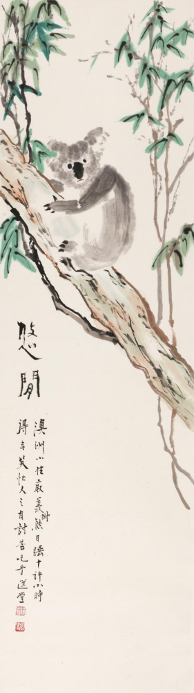 款识:悠闲。澳洲小住,最羡树熊日谁十许小时,得无笑忙人之自讨苦吃乎,选堂。