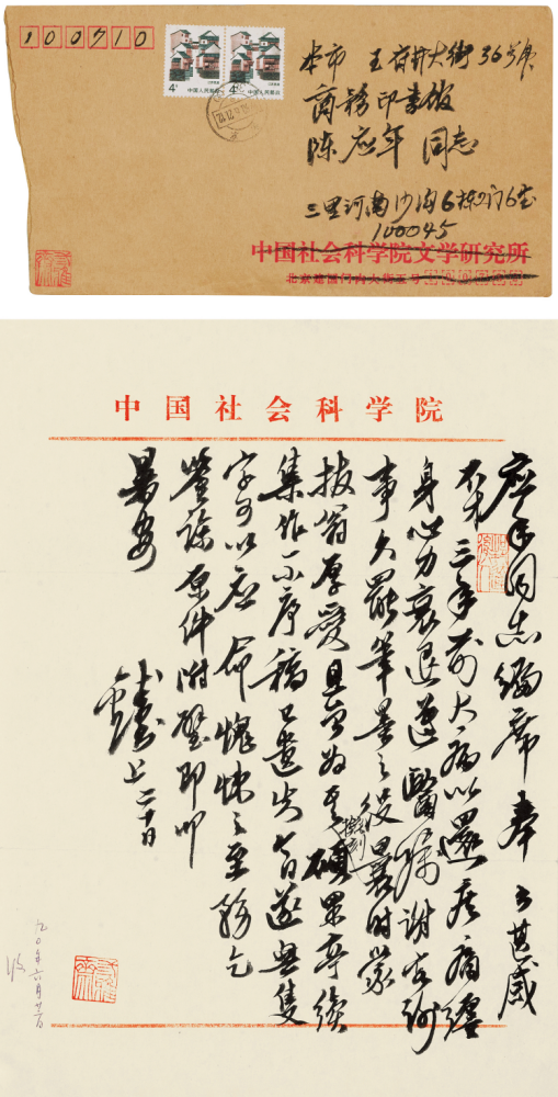 上款人:陈应年,1936年生,安徽滁县人。曾任商务印书馆历史室主任。翻译家。兼任中国译协第三届理事及社会科学翻译委员会委员、中华全国日本哲学会理事、中国日本史学会常务理事、北京中日文化交流史研究会副会长。钱钟书此信,为婉拒陈氏请序而作,信中谈及钱氏曾为前辈李宣龚之《硕果亭续集》作序,由于该书并未付刻,以致序言亦随之消失,未能向陈氏报命。钱氏时任中科院副院长。