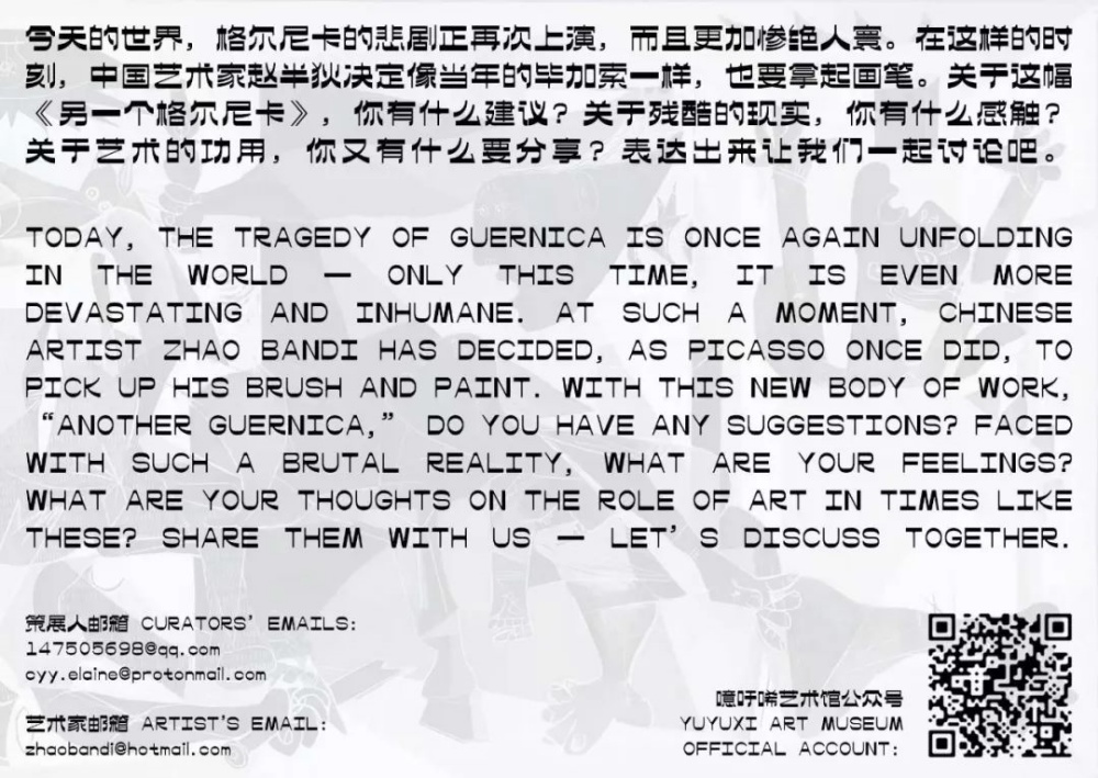 2025年,受噫吁唏艺术馆的委托,艺术家赵半狄将历时一年半来创作完成巨幅油画《另一个格尔尼卡》。