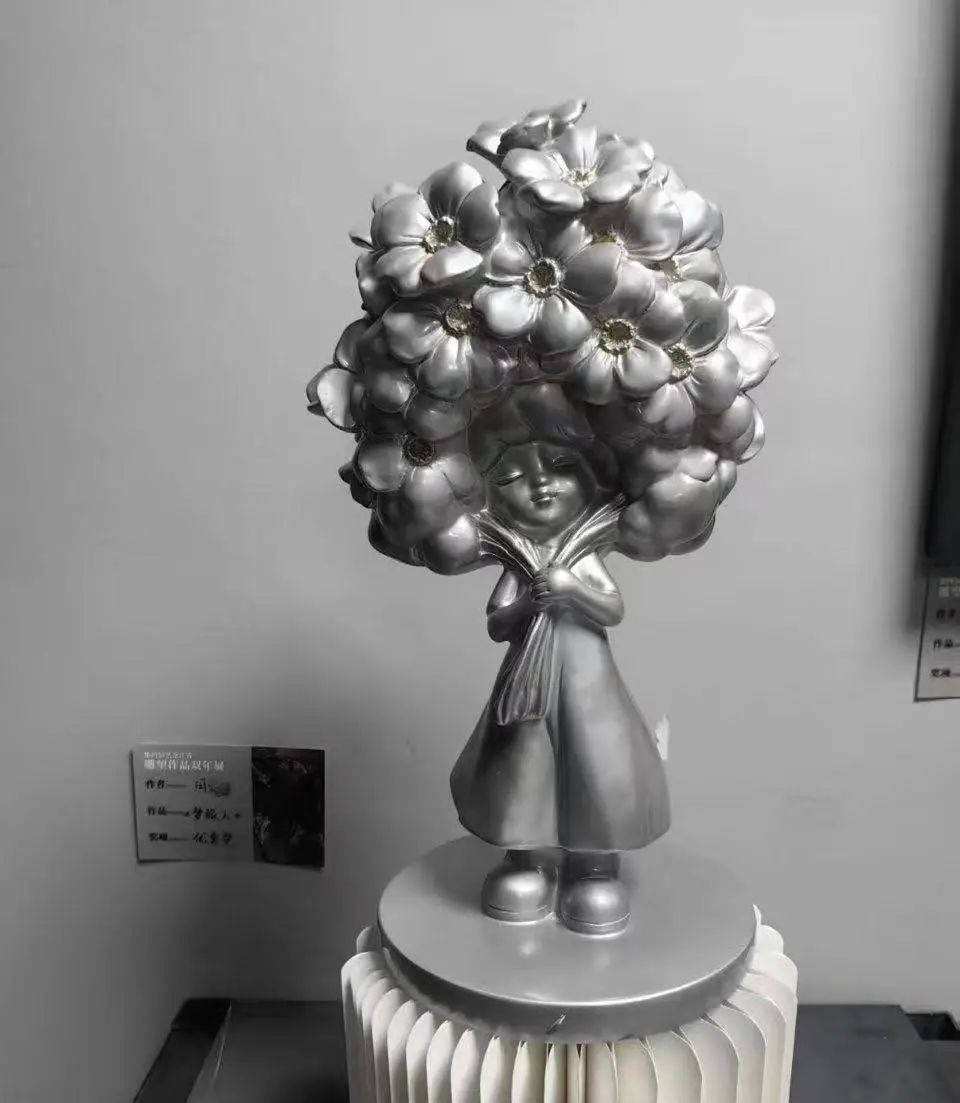 网友发布的图片显示,被指抄袭的雕塑作品名称《梦旅人》,是一个头顶上簇拥着大束花朵的女孩形象,作者为闫某某,荣获第四届黑龙江省雕塑作品双年展优秀奖。