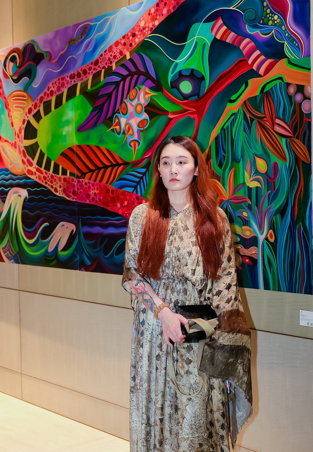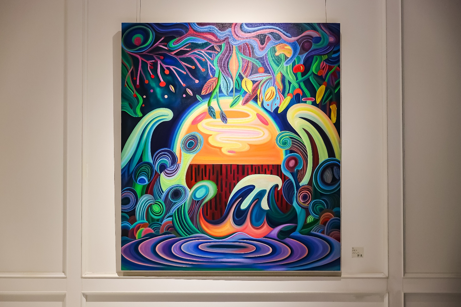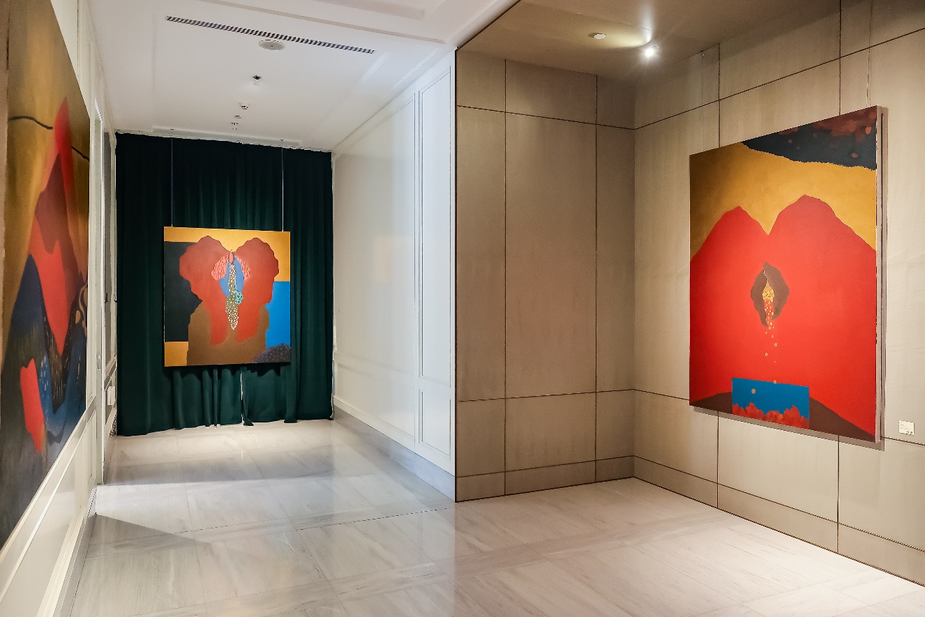 沿着左侧廊道,王愫的作品静静铺陈开来,像一处通往内心深处的地质剖面。在这里,她将目光投向更幽微的方向——山体内部的岩层、植物根系深处的水源,甚至是精神世界的能量流动。这些被她在画布上“剖开”的意象,既是自然的隐喻,也是心灵的具象。画面以对称或均衡式的构图展开,色彩典雅,线条克制,却因其清晰与流动性,隐隐释放出一种内在的震颤。这仿佛一处“爱的剖面图”——它不宏大,却深刻;不喧嚣,却在静默中指向一种更为本质的东西:爱的复杂性,以及它在真实生活中如何被一再打磨、理解与安放。