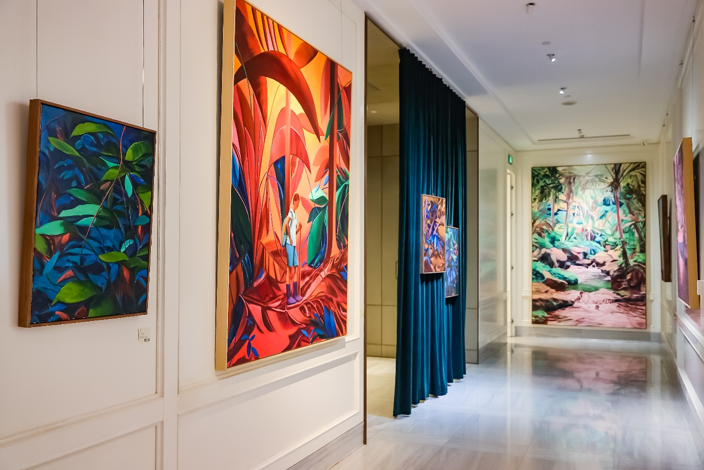 右侧廊道中,祁磊的画面像是一座无形的梦境森林,绿意密布,枝条低垂,像《仲夏夜之梦》中爱人们误入的林地,既迷失,也得以在此重新寻回。在这里,风的方向、植物的摆动成了节奏的线索,构建出模糊却有序的精神花园。他有意模糊着画面的边界,将留白、偏差、结构的不稳定化为情绪的呼吸,容纳爱的不确定与反复。那些作品仿佛对应着“卧室”或“窗前”——那是都市人内心的隐秘栖息地。