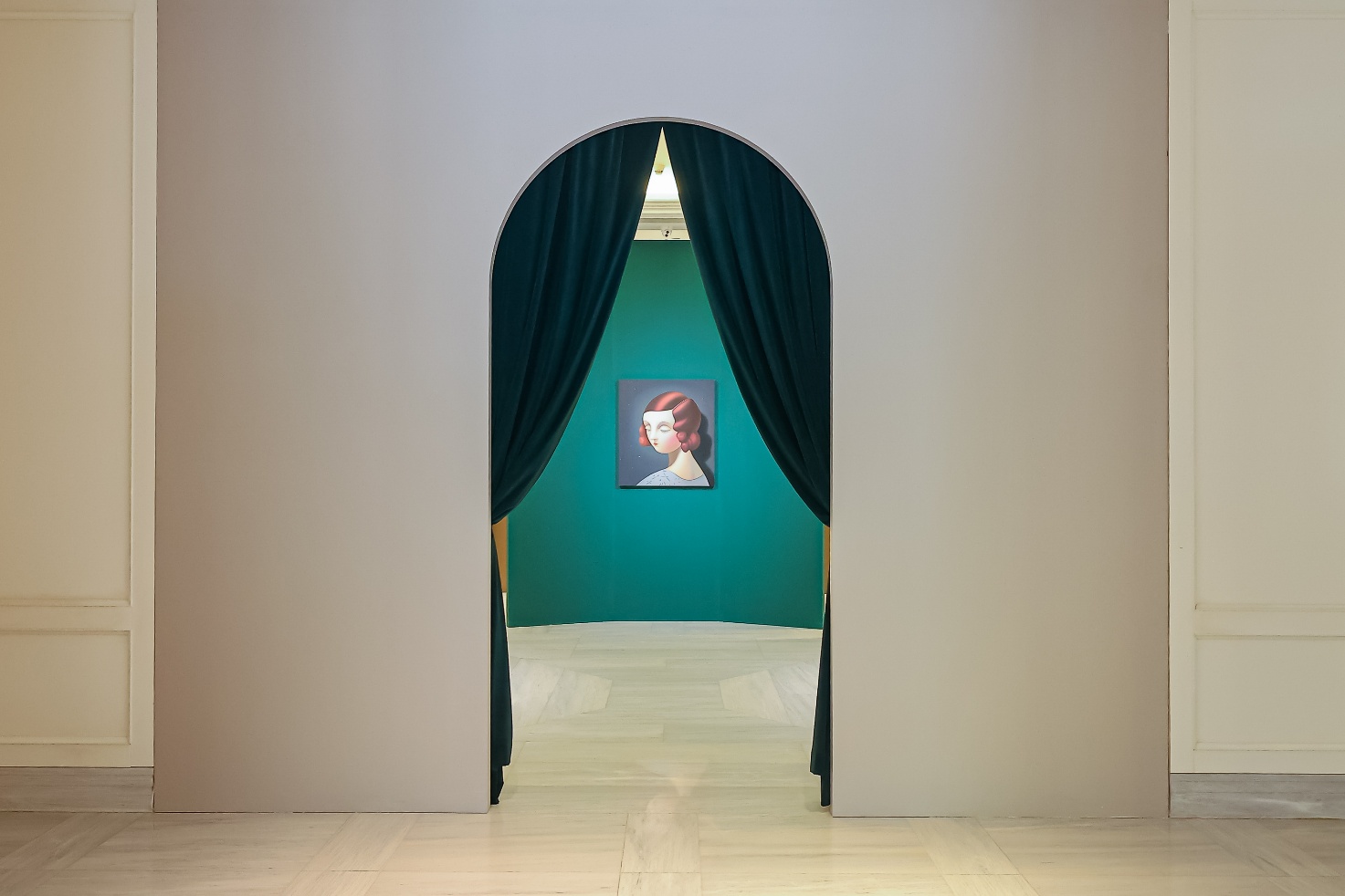 走进展厅,透过门廊就可以看到艺术家王一好的作品,引导观者进入梦境般的奇异空间。她从自我性别身份入手,对人物、空间、自然物等主题的描绘,亦虚亦实,搭建出以女性为名的超现实迷宫,似乎在表达了爱的本质:那是无法名状的感动、无法束缚的自由、无边界的心灵栖息地。