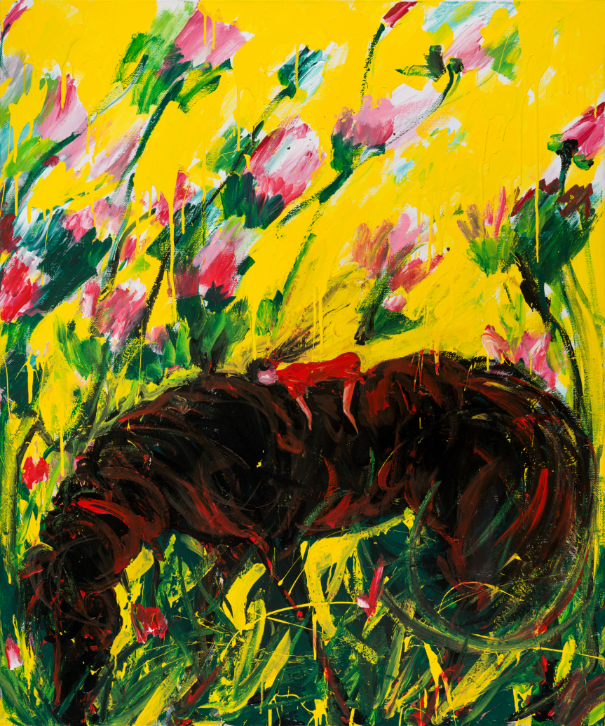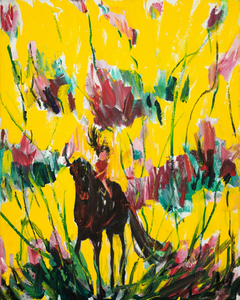 《马上如花·悬停》中,如花骑于马背之上,背景黄色留白制造虚空感,暗喻个体在永恒与瞬间间的精神摆荡。这种动态失衡的构图,挑战工业化社会的秩序束缚,呼唤回归本真,让心灵得以停歇。如花诞生于贾伟对于生命疗愈的深刻理解,从自我疗愈到大众共情,这也是贾伟以情感共情创作表达的一次神游。