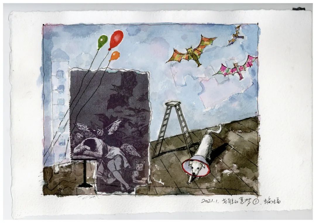 张晓刚,作品《蜉蝣日记:2022年3月15日-戈雅的恶梦》的草图 2021年 纸本水彩