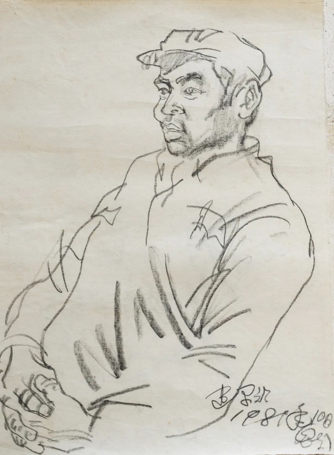 张恩利,工人肖像,炭笔素描,1981年,27.5×20cm