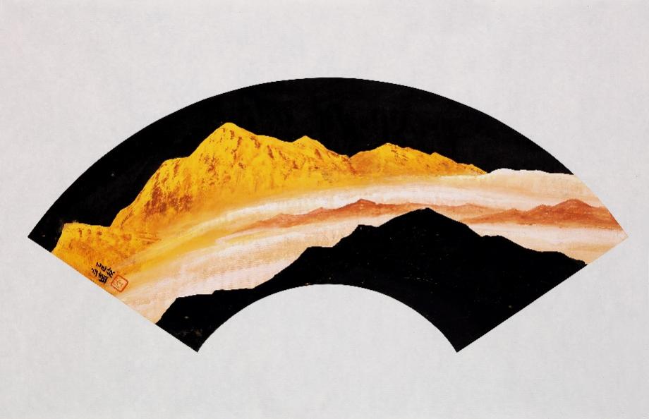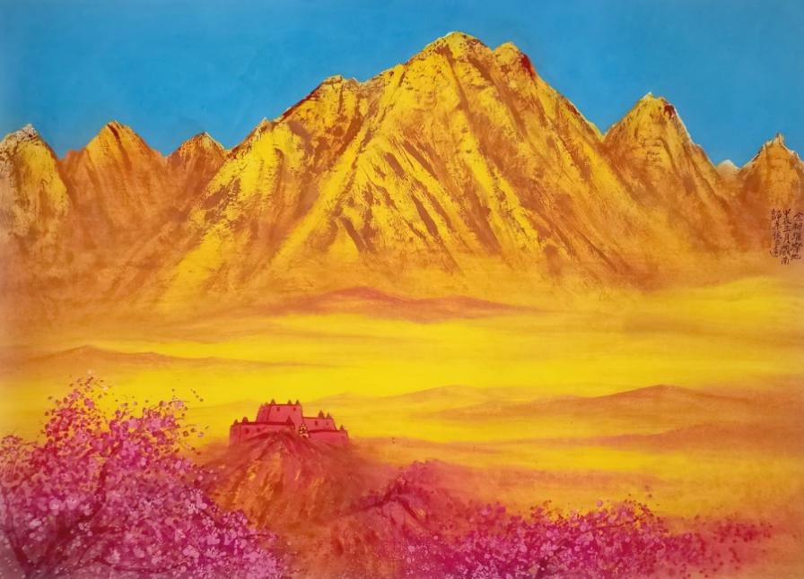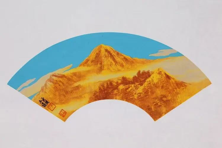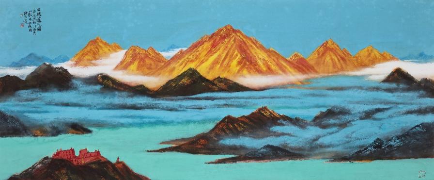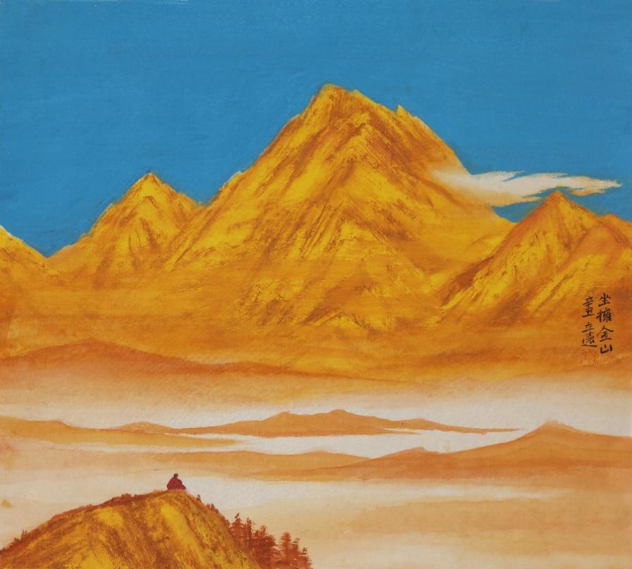 它的艺术创作分为三大体系:水墨、青绿与金碧山水,各承古意而各赋新声。水墨系列直溯王维画中有诗的南宗传统,以江南烟雨之虚澹蕴藉文人禅意,笔简意远处尽显外师造化,中得心源的哲思。青绿山水则重启唐宋庙堂气象,却破古人熟绢刻板之弊,融写意笔法于堂皇设色,使矿物颜料的辉煌与水墨的流动共生,重现云净山浮翠的宋人格调和韵致。金碧山水更以吸纳唐卡与闽浙大漆的制作方法,将日照金山的奇观,幻化为心生光明的视觉诗篇,在材质与境界上双向拓展了青绿、金碧山水画的历史维度。