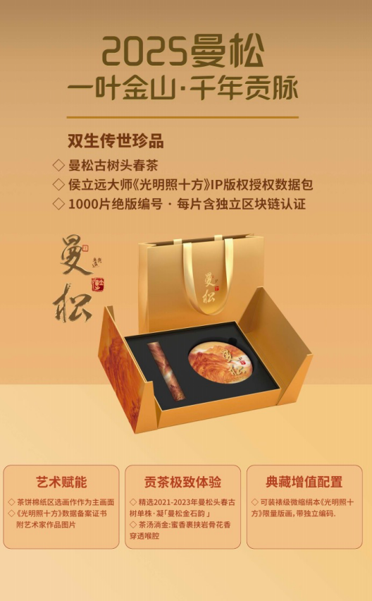 曼松古树头春茶与侯立远《光明照十方》作品的结合,限量 1000 片,每片均含独立区块链认证,极具收藏价值。