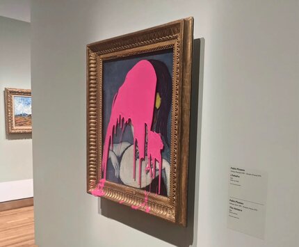 2025年6月19日,在蒙特利尔美术馆被泼洒粉色油漆的巴勃罗·毕加索作品《艺妓》. 图片提供:Last Generation Canada.