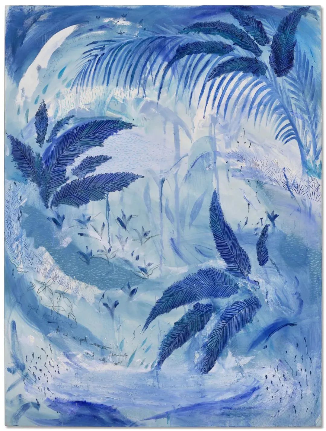 米凯拉·耶尔伍德-丹的艺术实践融合了黑人文化、酷儿社群、英国天主教教育等文化符号。在她绚烂的大尺幅绘画作品中,植物图案与日记式的沉思交织在一起,佐以金箔、施华洛世奇水晶、水晶甲等复杂的装饰元素,并点缀着引用的对话文本、歌词、诗歌、耳熟能详的短语等日记般的题词。