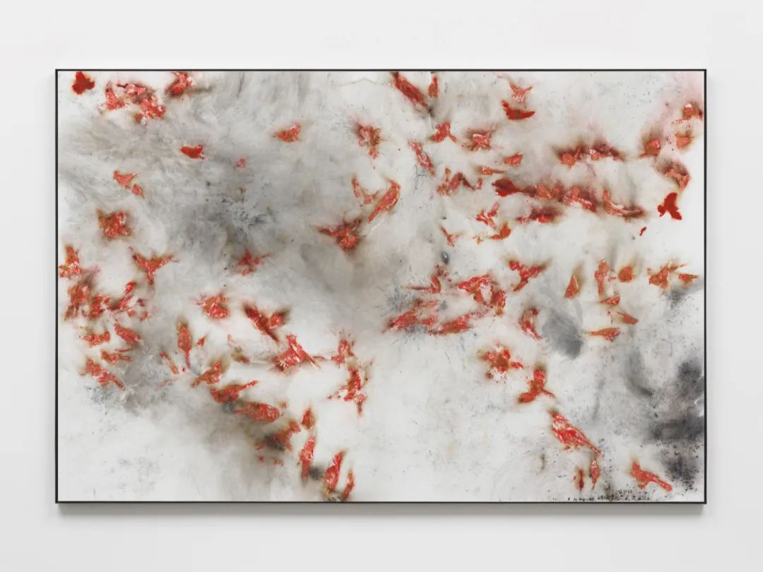 白立方将于6月在巴塞尔艺术展(展位C13)中呈献多件蔡国强的火药绘画作品,包括2022年的创作《红鸟》(Red Birds)。