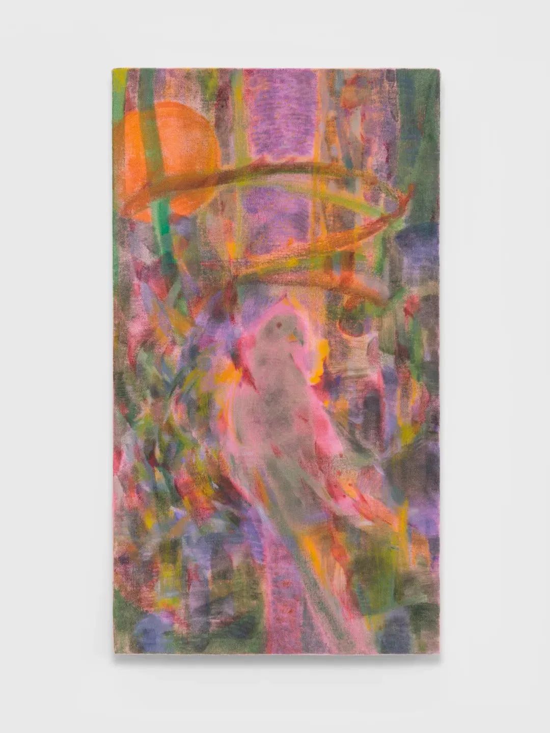 汪晓芙《小鸟着火了》,亚麻布面丙烯,76 × 42.5 cm,2025
