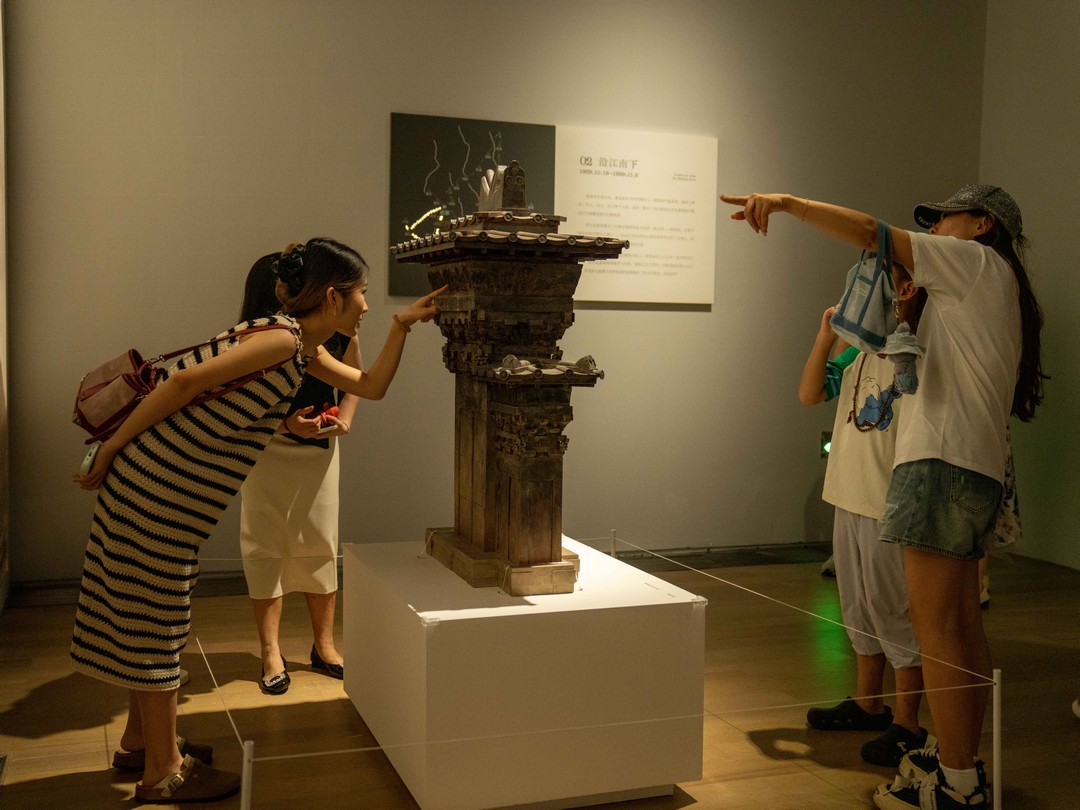展览展陈通过学术文献与视觉融合的方式,以刘敦桢先生的《川康调查日记》视角与田野调查照片带领观众追随学社足迹,走过复刻的李庄工作室、渠县汉阙田野考察场景,闻墨香、触摸建筑浮雕,配以后人口述、AI动效、点云数据等十余处影像资料,为观众精心构建出沉浸式体验空间。