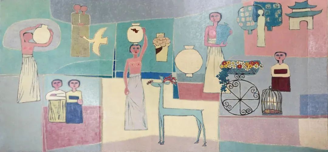 金焕基是韩国艺术界最国际化的人物之一,也是韩国抽象画的先驱。《女人和坛子》原为20世纪50年代韩国最大纺织财阀SAMHO集团的会长郑宰昊新建住宅时,作为大型壁画订制的作品。在60年代末随着SAMHO集团的衰落,这幅作品出现在艺术市场,之后被李健熙收藏。
