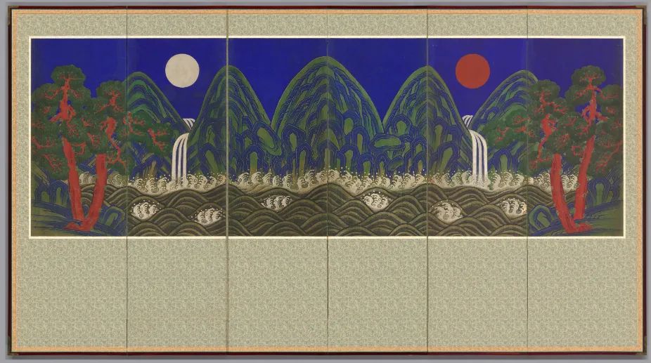 六幅折叠屏风《日月五峰图》,19世纪,
