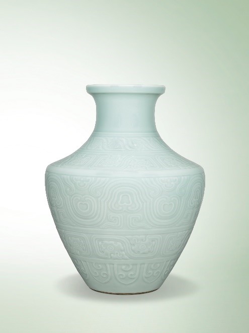 此清乾隆粉青釉刻古铜器纹罍式尊为乾隆时期陶瓷工艺的典范之作。此器造型古朴俊美,釉色光洁莹润,其纹饰灵感来自西周青铜器皿罍,造工精美讲究。此尊为仿古青铜瓷器,形制类近的乾隆逸品仅有数例,分别藏于鲍氏珍藏和望星楼珍藏等多个显赫珍藏,足见其珍稀不凡,极具艺术价值。