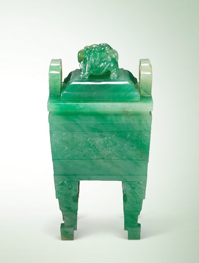此晚清翠玉饕餮纹瑞狮纽兽足双耳方鼎式盖炉采用仿古方鼎器型,色泽翠绿纯净,并雕刻生动细致的饕餮纹和一对瑞狮,体现晚清时期的鉴赏品味,以及皇家的尊贵地位。翡翠于晚清乾隆年间渐受重视,以翡翠为原料的工艺品成为极其贵重的珍玩,成为皇家身份的象征,亦常见于清代帝后的绘画之中。此炉为藤田男爵旧藏,其中国艺术珍藏大部分来自恭亲王珍藏。此御品宝物乃同类翡翠香炉中最精者,足以与全球各大传奇珍藏和拍卖中的佳作媲美。