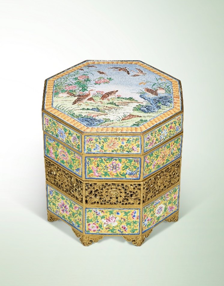 此清乾隆铜胎画珐琅八方雁安黄地番花煖砚巧夺天工,华实兼具,堪称乾隆时期工艺的巅峰之作。据清宫档案记载,这件精巧绝伦的煖砚于乾隆元年十一月奉旨订制,至翌年十二月方告完成。八方叠盒内置端砚和可以放置火炭的双提梁炉,既为文房用品,亦为工艺珍玩,而内部施松石绿釉,白釉外底中央为蓝料书双方框「乾隆年制」楷书款,彰显其历史价值和宫廷御制的显赫来源。