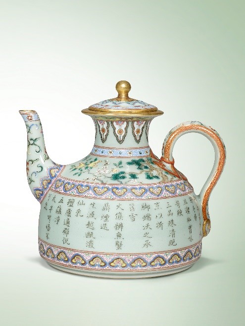 专题拍卖的领衔之作为清乾隆洋彩粉青地御题三清茶诗茶壶(上图),壶腹部墨书乾隆御题「三清茶」诗,随「干」、「隆」红料印。肩部以珐琅彩料绘以梅英、松实和佛手纹样。此「三清茶」诗茶壶为目前已知唯一的存世孤品,不仅是弥足珍贵的文人雅玩,更寓意治国修身之心。