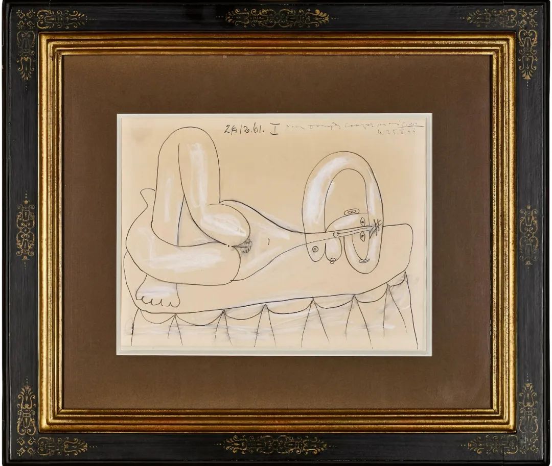 这幅作品是毕加索艺术生涯晚期极具代表性作之一,诞生于其与英国收藏家道格拉斯·库珀在法国南部城堡的独特合作项目中。这件作品以极简的单色水平构图呈现,展现了毕加索对线条的高度提炼能力,将卧姿裸女这一经典主题转化为充满雕塑感的平面符号。