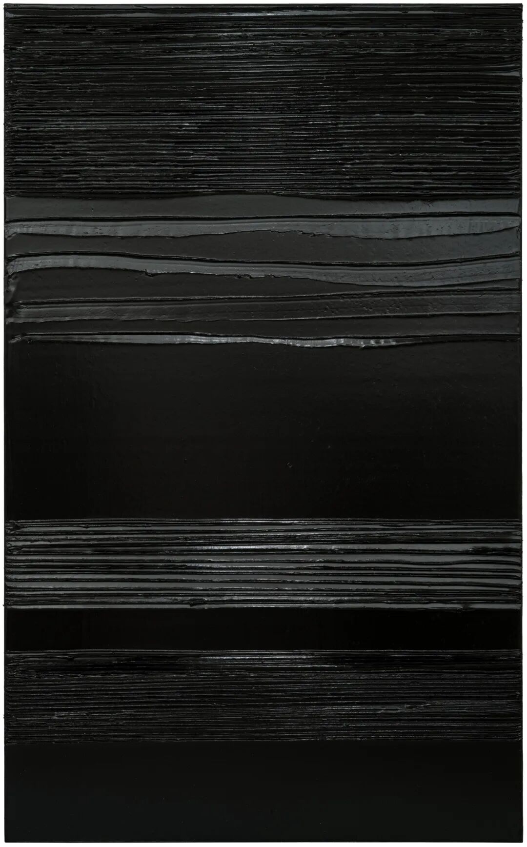 此作是皮耶·苏拉吉享誉盛名的“Outrenoir”系列中的典范之作,凝聚了艺术家对黑色毕生的执着探索,他摒弃具象表达,专注于颜料本身的物理与视觉特性。这幅逾两米高的巨作表面,交织着宽窄深浅不一的水平笔触,构成一幅肌理丰富的画卷:起伏的纹路、沟壑与峰脊巧妙捕捉并反射光线,营造出令人沉醉的光影变幻。苏拉吉将颜料与丙烯树脂混合,创造出哑光与光泽表面的对比,让作品肌理更为丰富。