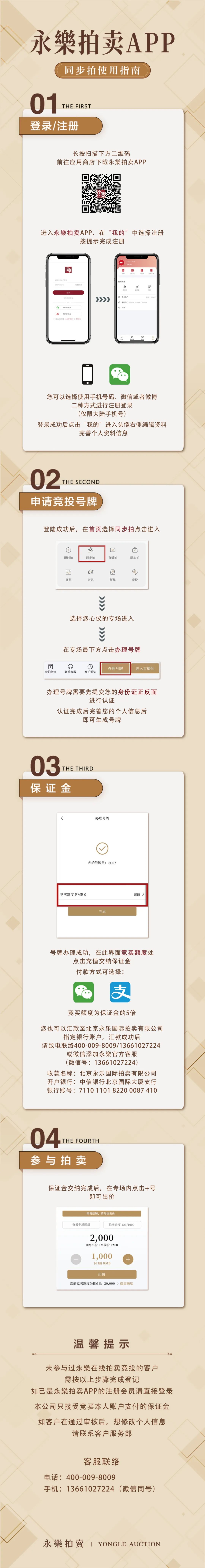 为了给广大藏家提供更优质便捷的服务,「永樂拍卖APP」、「艺典拍卖小程序」为您准备线上同步竞拍系统。通过永樂拍卖APP或艺典拍卖小程序进入拍场,缴纳相应的拍品保证金,即可竞投心仪拍品,让您足不出户就能享受“亲临拍场,即刻竞拍”的竞投服务。