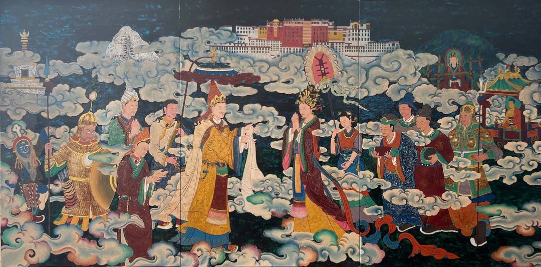 《和谐金桥》仁青朗加、邓珠尼玛、德青绕珠,120×240cm,唐卡漆画