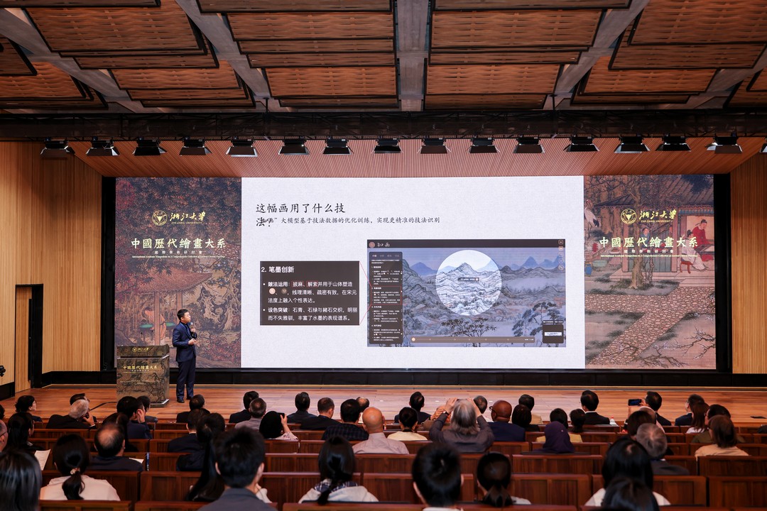 成果发布环节,“中国历代绘画大系”之《先秦汉唐画全集》第3-6卷11册,《宋画全集》第9卷3册,《元画全集》(台北故宫博物院藏品卷)10册,以及图目系列之《明代绘画卷》《清代绘画卷》等新成果出版亮相。由浙江大学艺术与考古图像数据实验室、杭州全息智能技术研究院、浙大城市学院等联合研发的“中国传统绘画大模型”首次发布,展示了人工智能技术在传统绘画研究与创作中的创新应用。浙江大学艺术与考古学院与葡萄牙里斯本大学艺术与人文学院签署了学术合作框架协议。