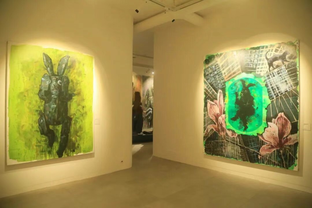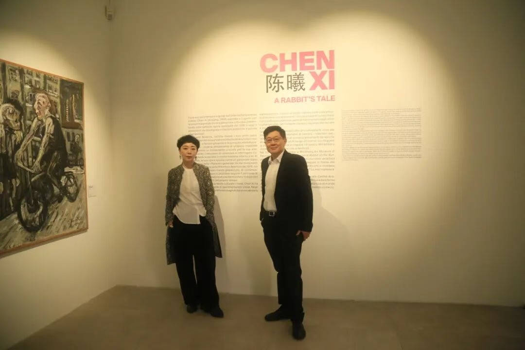 艺术家陈曦和策展人吕澎在“陈曦:兔子的故事”展览现场