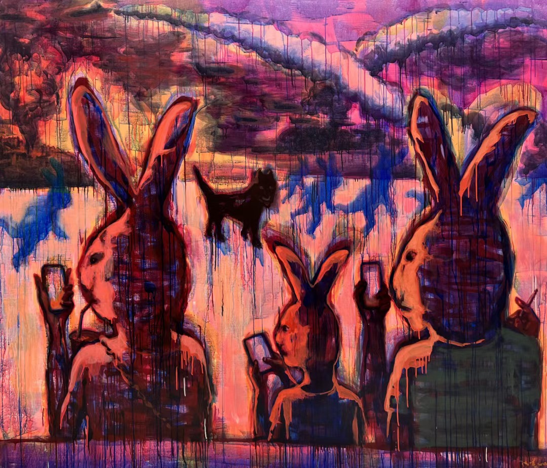 在陈曦创作中,隐喻不是修辞的附庸,更像是让思想晦涩显形的本体。那些在都市夜色中沐浴的女性,那些辨认不出形象的小人物形象,直至黑色兔子的出现,不仅是意志在场的宣言,更是对规训社会的沉默抵抗——当身体挣脱了具体的社会身份闯入画面,一种关于存在的本真性便在这一刻悄然绽放。它们暗示着一种不被固化的流动状态,拒绝被任何单一话语所捕获与定义。就像她自己说述“我所忧虑的不是我个人或者某个人群的问题, 而是对今天的整个人类精神及行为的某种质疑”。