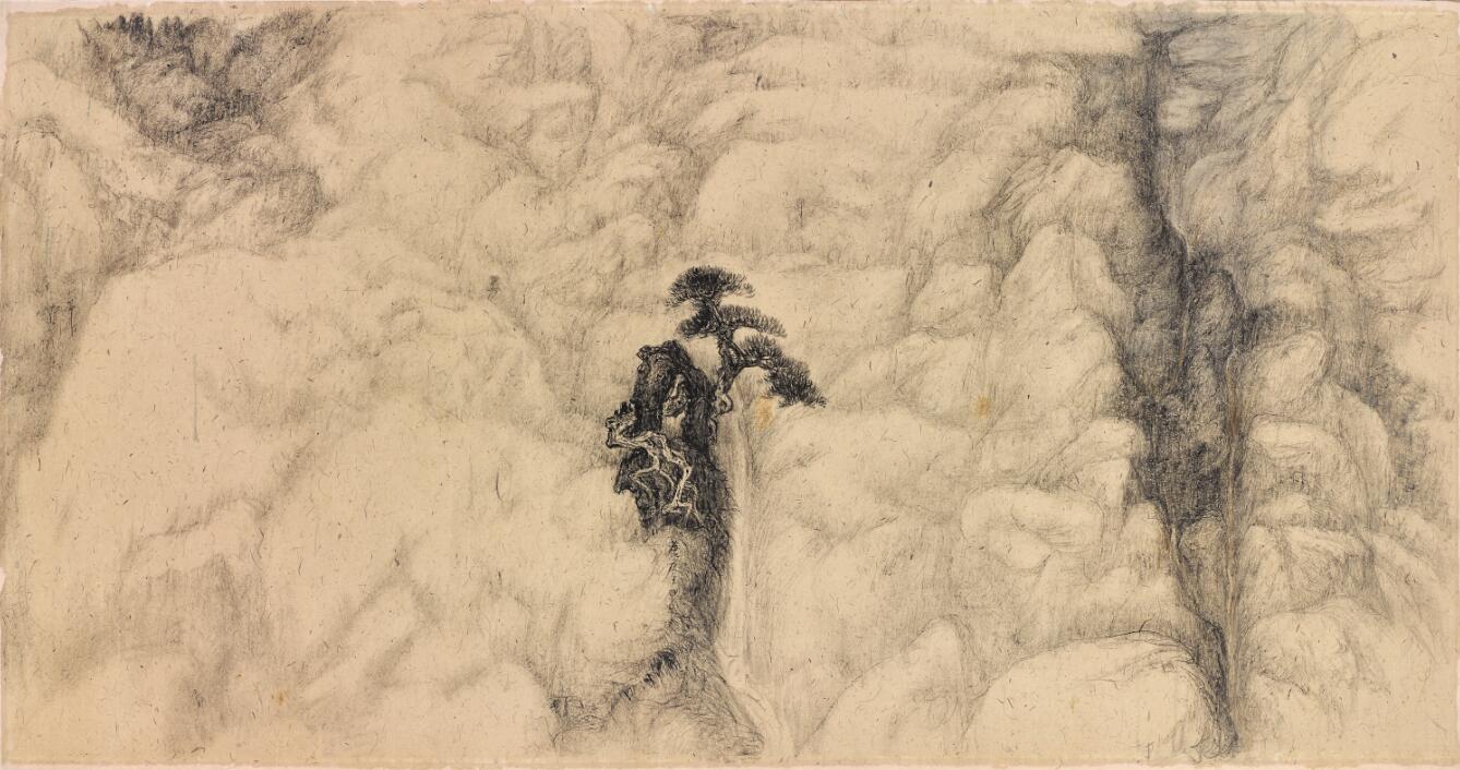 2020年以来,彭康隆开始探索以北宋山水为灵感的巨幅构图形式。自明代沈周(1427-1509)、董其昌(1555-1636)之后,到清代的王翚(1632-1717)、龚贤(1618-1689),再到近现代的黄宾虹,山水画家开始不断探究如何将北宋宫廷山水的构图尺幅与元代文人画中极具个性和表现力的笔法相结合,并以集此二者之大成为目标,不断实践。而彭康隆「集大成」的不同之处在于,他不仅仅是将宋元明清的构图和笔法融会贯通,同时也将山水和花卉这两种题材进行交叉融合,相互渗透。