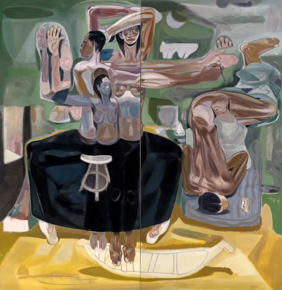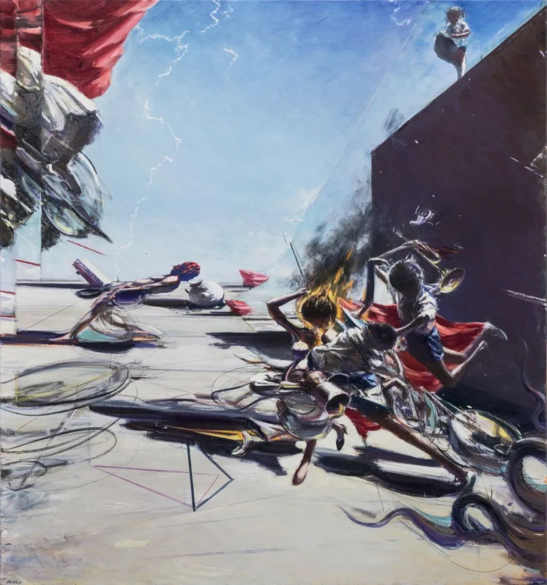 贾蔼力,《午后的合唱鏖战》,亚麻布油画,128 x 120 cm,2021 图片致谢永樂艺术空间