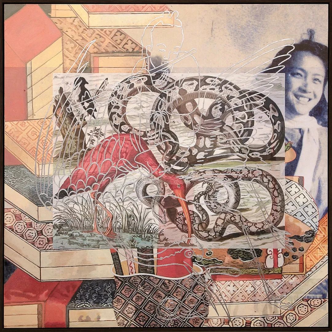 申京美, 《册架图与蛇》, 照片转印、丙烯颜料、木板, 93 x 93 cm, 2025 ©桉画廊