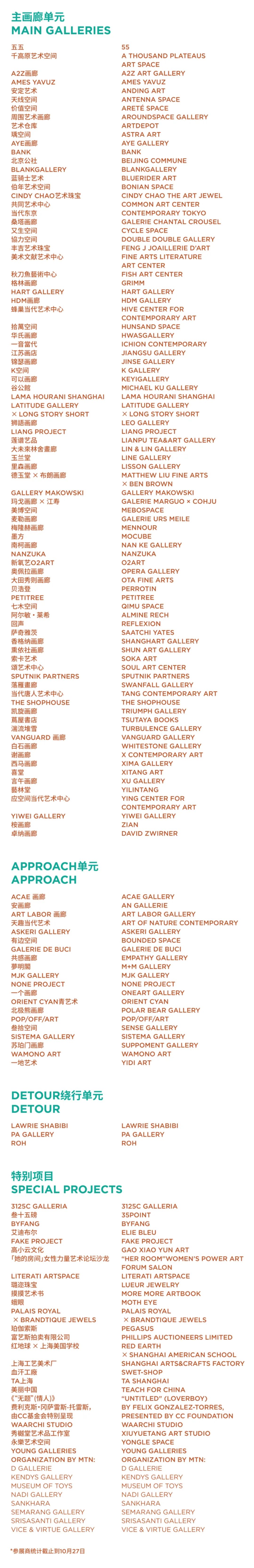 实力斐然的中国画廊构成展会阵容的核心,代表着ART021 SHANGHAI 支持核心艺术社群的承诺。连年回归的面孔及不断加入的新鲜势力,将为本次展会提供值得探索的丰富内容: