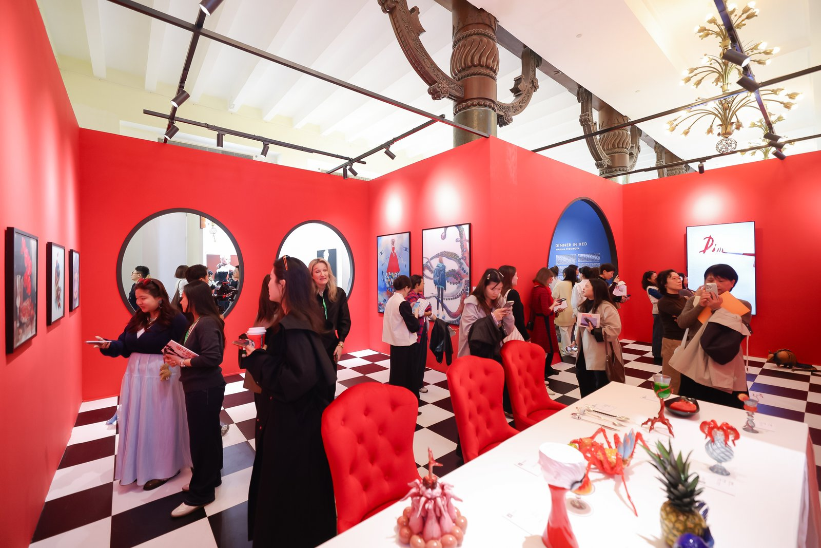 《开幕首日,《红色晚宴》就被观众的热情彻底点燃。玛丽娜身穿红裙出现在现场,与展位的红色氛围相呼应。人流持续不断,熟悉的朋友、新观众、藏家、媒体,以及许多被吸引而停下脚步的人将整个空间填得水泄不通。
