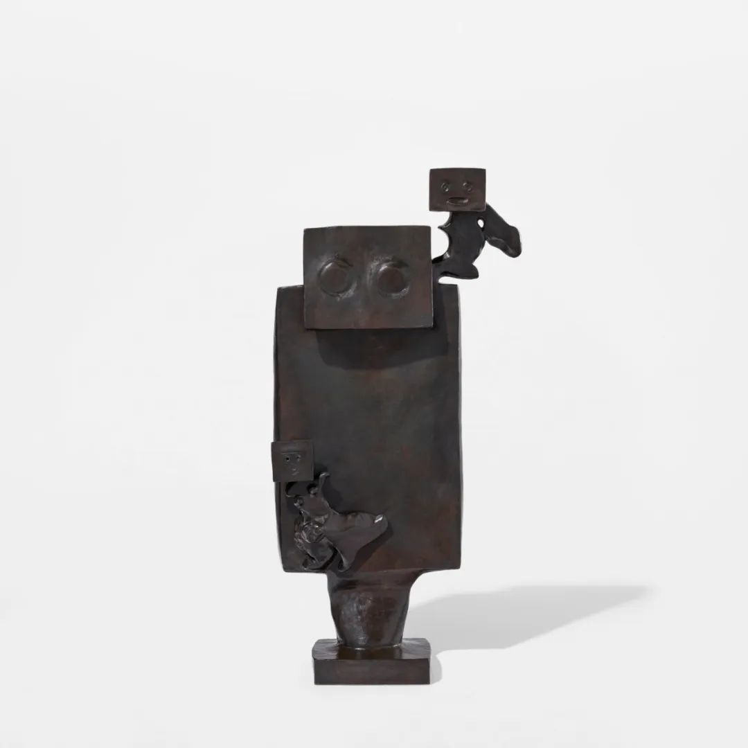 马斯·恩斯特1960年的铸铜雕塑《雅典的街头》彰显其成熟期特有的荒诞诗性。这件由艺术家妻子多萝西娅·坦宁珍藏的佳作,以矩形躯干与攀附的小精灵构建出图腾般的超现实叙事,其铸造工艺延续了他将日常器皿通过石膏翻模重组的创作方法,使平凡物象在三维空间中焕发神话维度。
