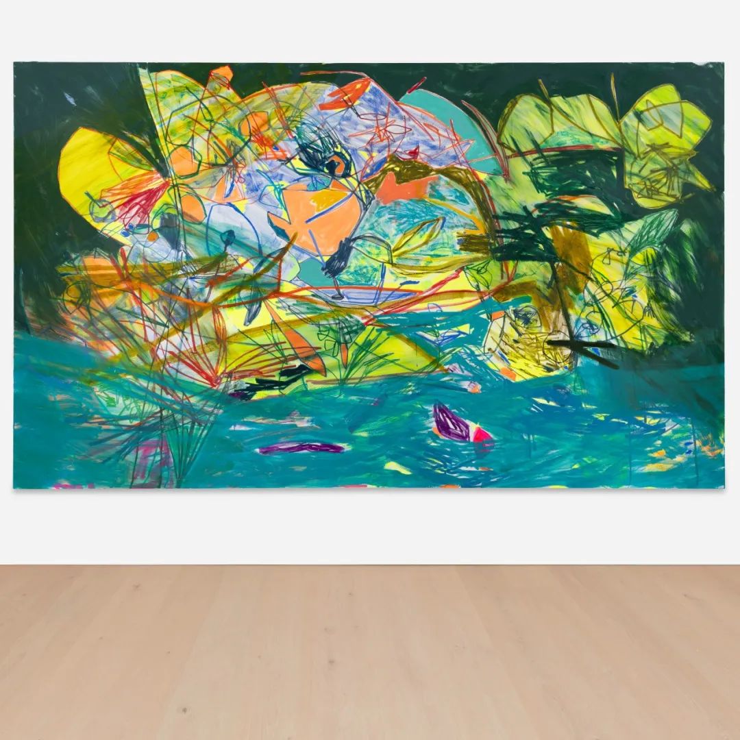 贾德·法多朱蒂米2022年作《无题》以流动的翠绿与青蓝构筑起一片沉浸式场域。她将丙烯薄涂与油彩棒线条交织成半透明层次,刮擦出的痕迹如记忆的律动,在抽象与景致间形成充满生命力的沉浸式场景。