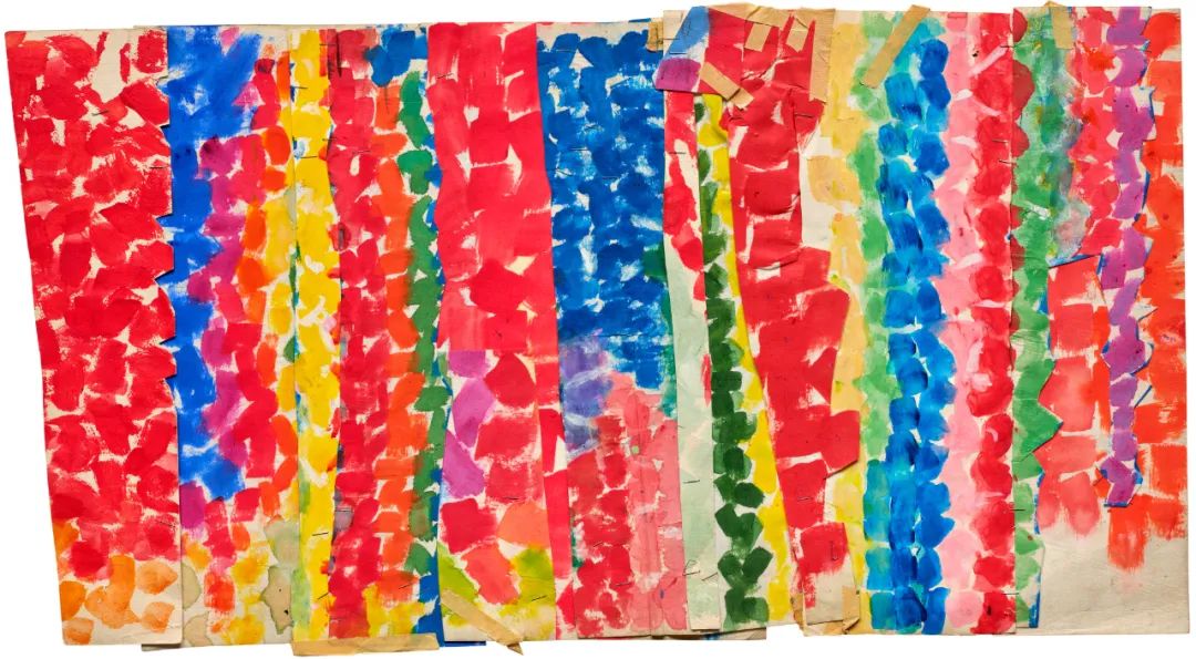 艾玛·汤马斯的《无题》是艺术家晚期艺术生涯中转向抽象的关键之作,以自然为灵感,构筑出充满韵律的色彩场域。这件作品以层叠的矩形色块垂直排列,宛若风动林梢或俯视花坛时色彩的流转,其拼贴纸本上的色带从红黄渐变至蓝紫,形成一条流动的光谱。托马斯将这类创作称为“阿尔玛的条纹”,通过留白与色彩间隙,让画面呼吸,赋予静态构图以动态能量。她深受塞尚结构用色与伊顿包豪斯色彩理论的影响,在抽象中凝练视觉与精神的对话,践行其“色彩即生命”的艺术哲思。