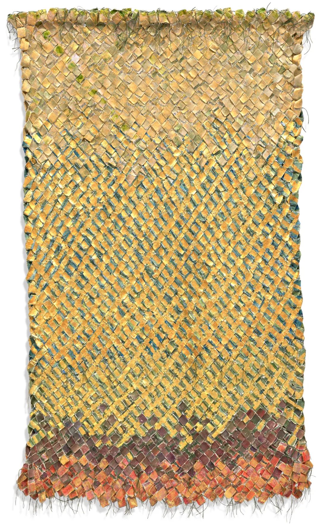 阿玛拉尔在此作中实现了编织与雕塑的完美融合。受包豪斯学派影响,她以亚麻为基底的网格结构覆以石膏、丙烯与金箔,将安第斯山脉的地貌记忆转化为抽象的光色诗篇。金箔的运用既呼应前哥伦布时期的黄金传统,又暗合日本金继哲学,使织物在虚实之间既承载着土地的温度,又焕发出超越物质性的灵光,终将古老的编织技艺升华为一场视觉的炼金仪式。