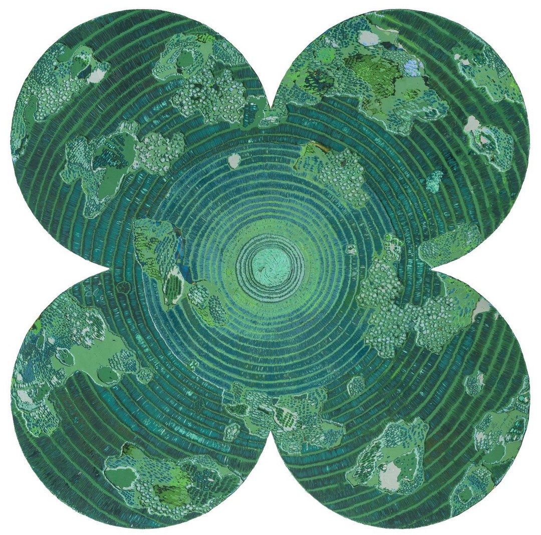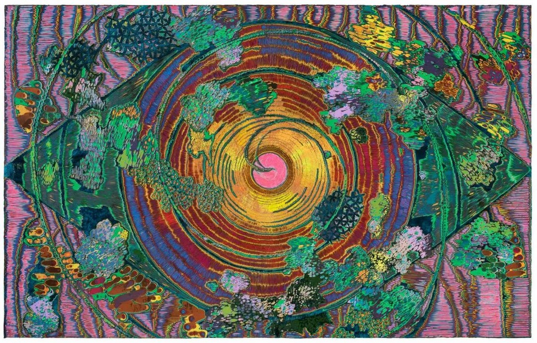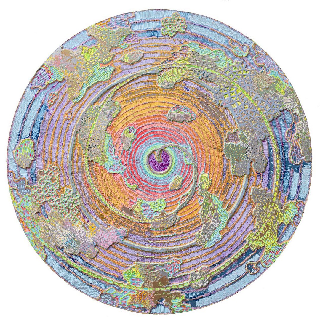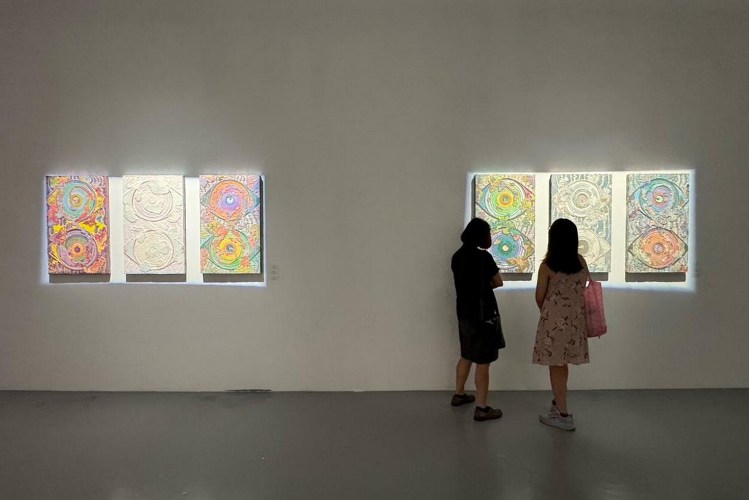 姜淼的获奖作品《始基之轮回》,正是以木刻语言为核心,融合版画阴刻阳刻技法,经三十余层丙烯叠加与手工刀刻,突破二维边界,将“天人合一”“生命轮回”的东方哲思转化为立体肌理。