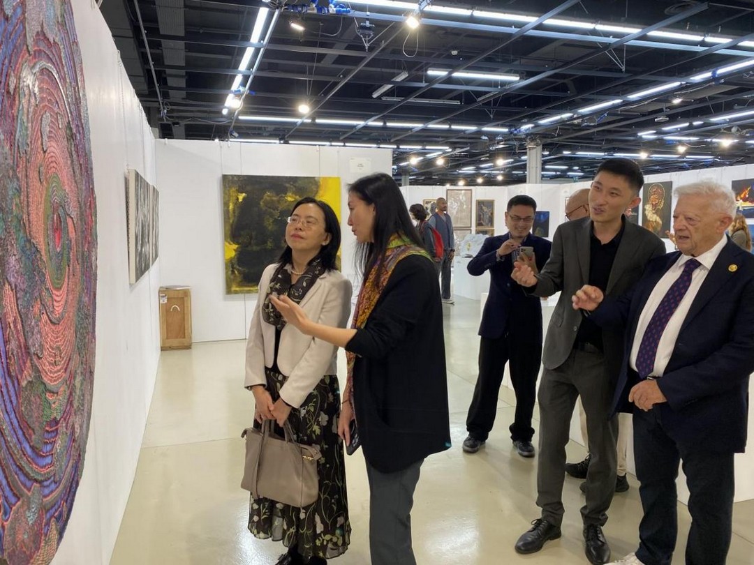 (艺术家姜淼为尹琦总领事讲述创作理念)